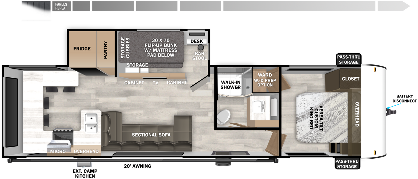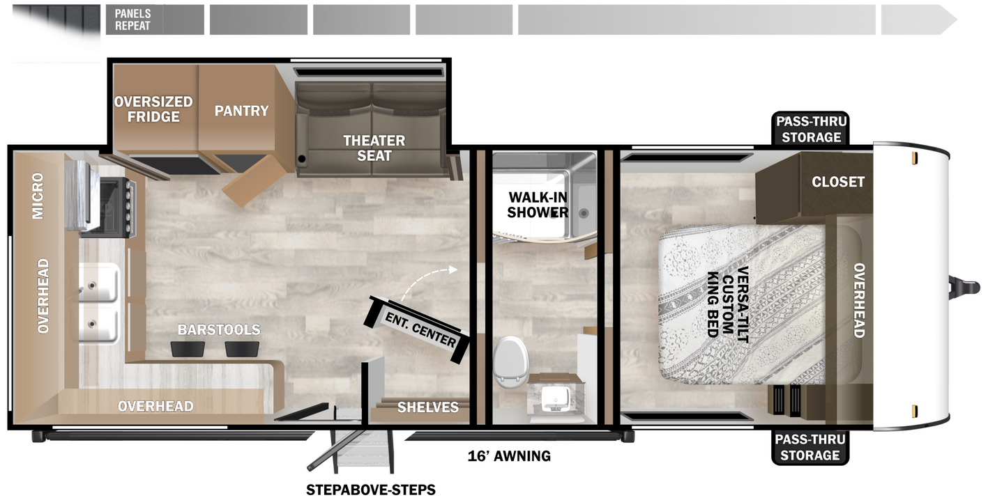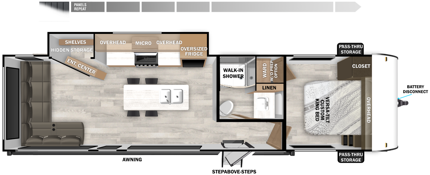 Versa-Tilt Bed, 200W Solar Panel w/30AMP Controller, Upgraded Designer Furniture Package, Heated & Enclosed Accessi-Belly (w/ Removable Underbelly Panels), MORryde™StepAbove Triple Step, Large Capacity 11 CU FT Frost-Free Refrigerator (12-Volt), Exterior LED Light Strip Under Awning, Seamless Countertops (No T-Mold), Modern Cloth Roller Shades w/ AutoStop, Green PKG: Roof Mount Solar Prep & LED Mushroom Lights, Power Awning w/ Adjustable Legs, Power Tongue Jack w/ LED Light, Quick Drop Stabilizer Jacks, 30” Built-In Electric Fireplace (Heater), (2) Zone Residential Soundbar (FM, Bluetooth, HDMI & USB), Ext. Convenience PKG: Friction Hinge & Baggage Door Magnets, Stainless Steel Roll Up Sink Cover, Slide-Out Awning Prep, Black Tank Flush, and Designated CPAP Storage