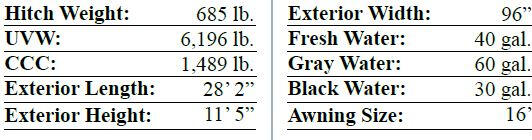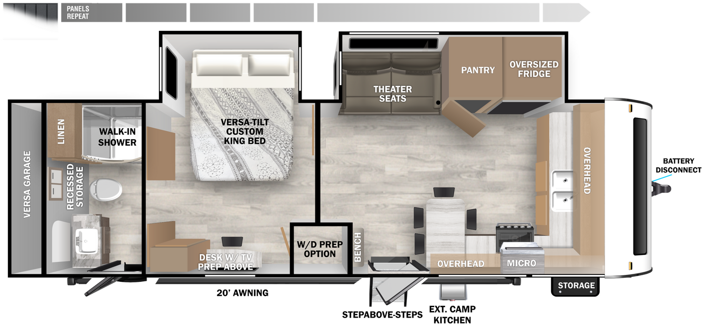 The 28FKG is the perfect Front Kitchen couple's coach. Featuring 19 Linear Ft. of counterspace, Massive master bedroom with desk area, and versa-garage storage allowing for maximum camping storage. The bathroom is easy and convenient to get to from either the bedroom or outside.